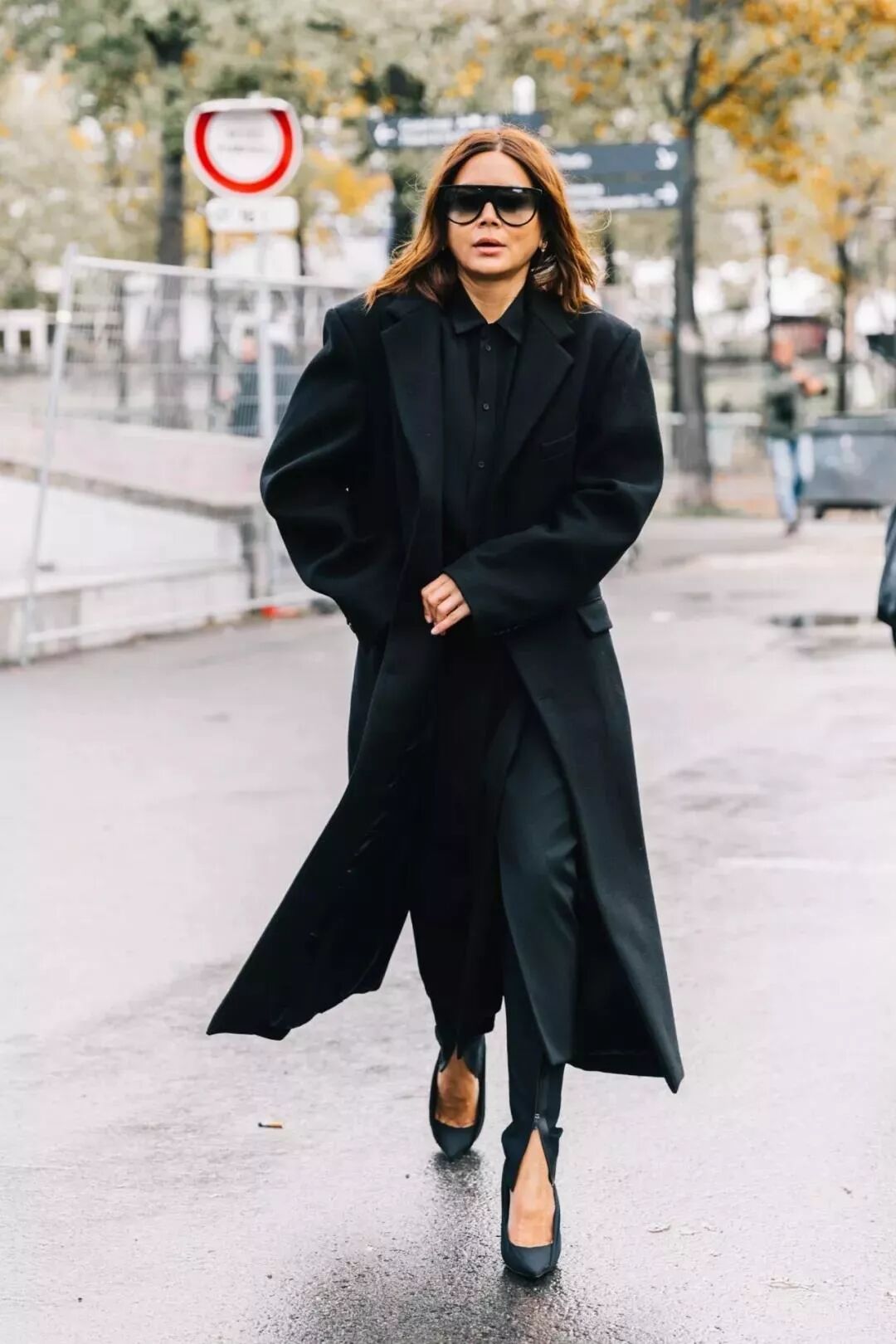 黑色襯衫搭配黑色大衣,全黑的穿搭氣場十足。