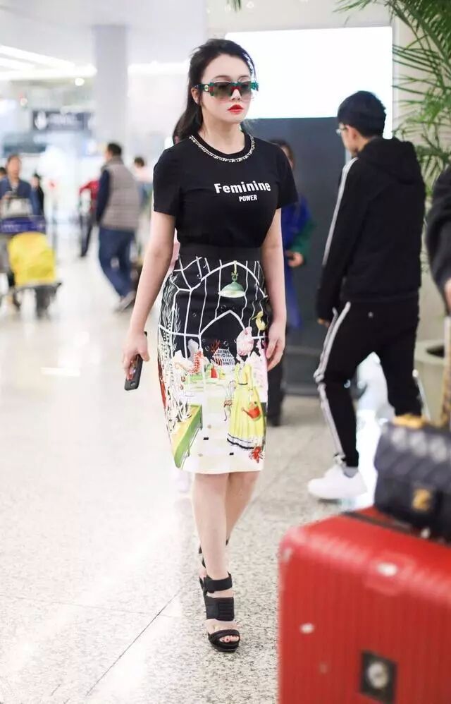 黑色的T恤搭配著高腰裙,裙子特殊圖案的設計和冉瑩穎墨鏡高馬尾的搭配,一身下來很有貴婦的氣質!