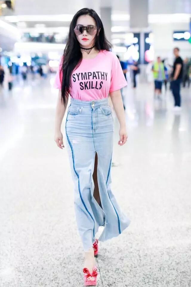 一雙粉色的高跟鞋和粉色上衣,上下呼應。高腰的牛仔裙也是夠高的,給人一種胸以下都是腿的錯覺!而且這個開衩口也是高的離譜,小碎步走還好,大步走怕是要走光吧!