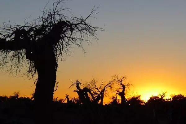 黃昏下漫步怪樹林,枯死之後千年不朽的胡楊樹姿態萬千,在落日的映襯下淒美而蒼勁,他們不悲不棄,譜寫著屬於沙漠胡楊的神話。