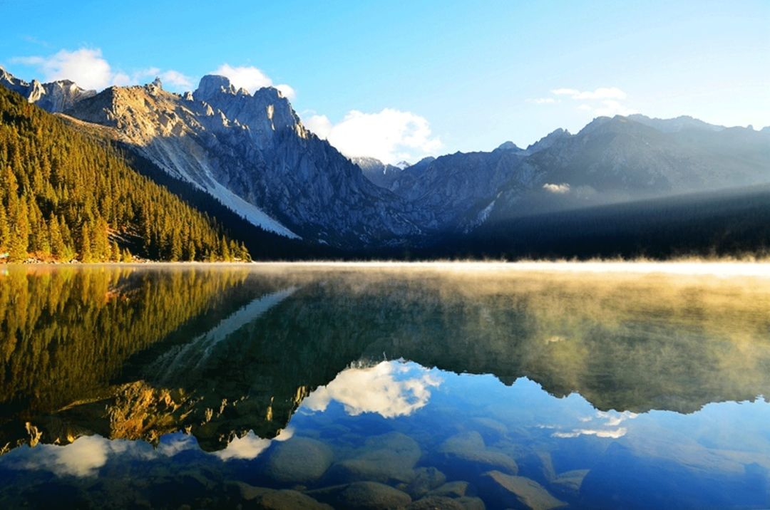 喀納斯湖畔的白樺、紅松和冷杉交叉出金黃、橙紅、黛綠的色彩,烘托著山頂耀眼的雪色,投映在翡翠石般的湖面之上,光彩奪目。
