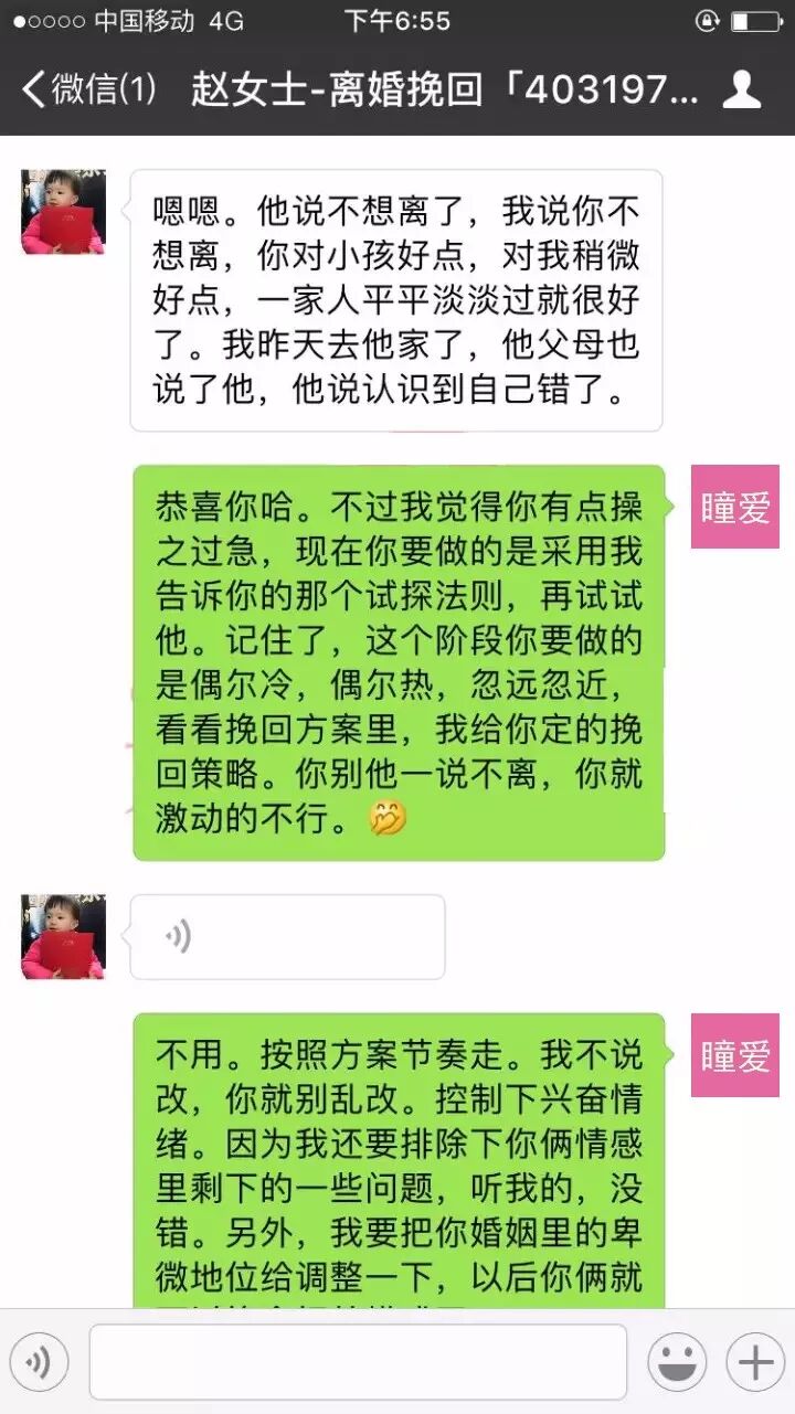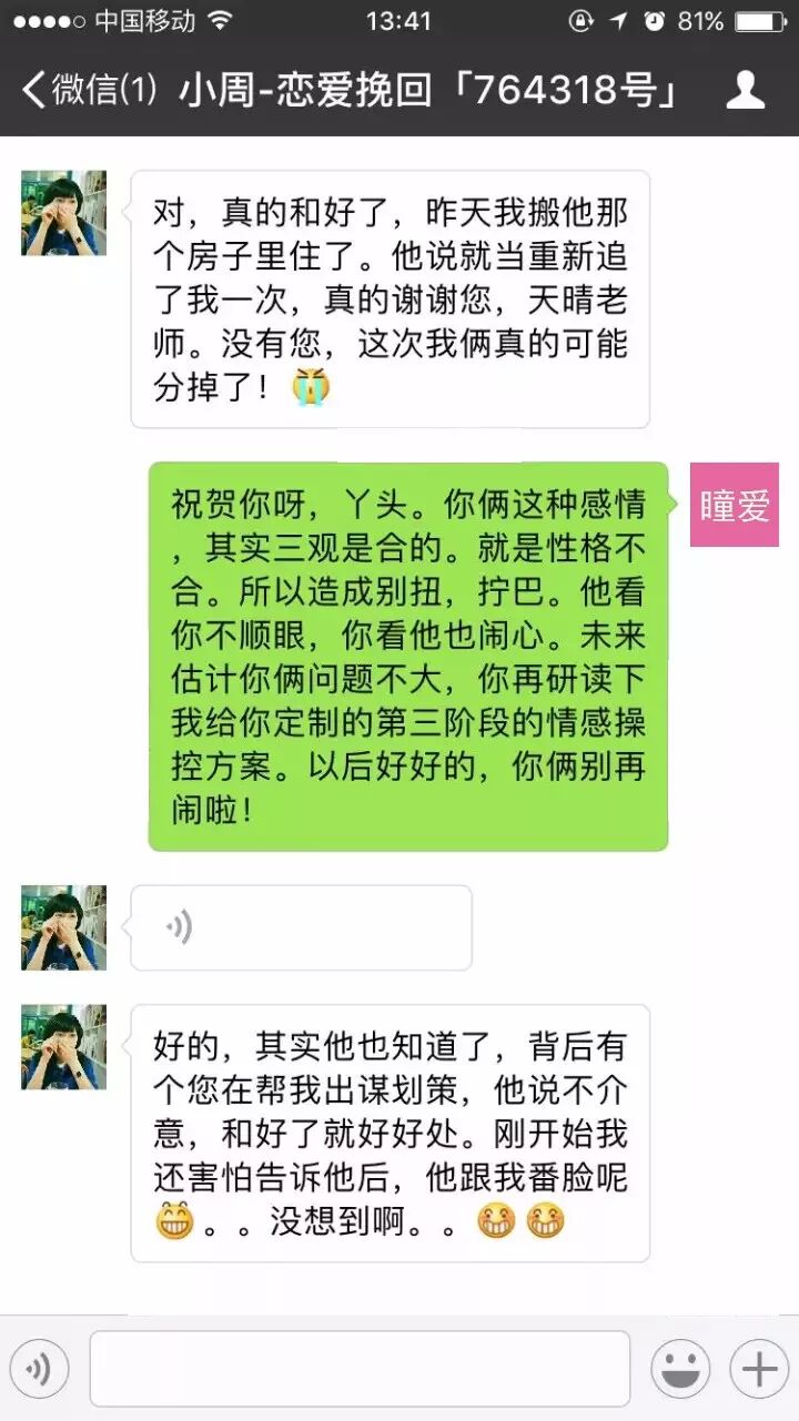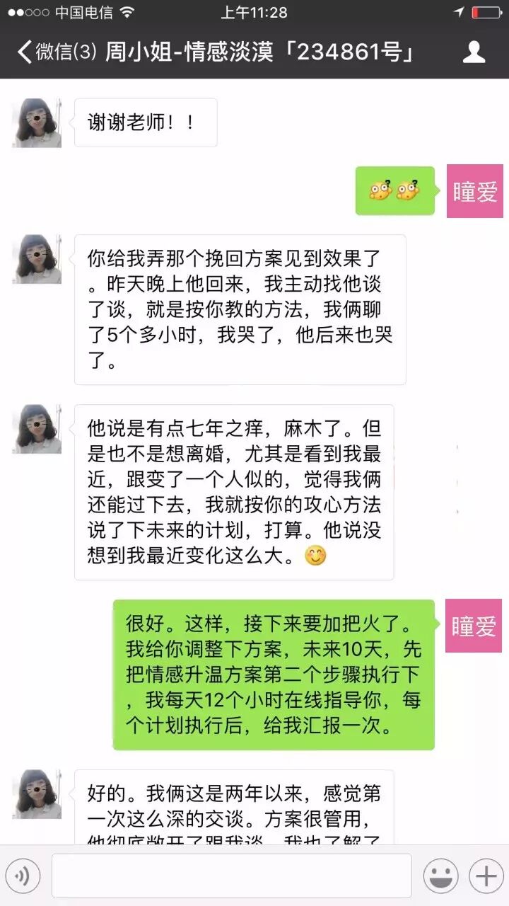 115我之前也在瞳愛做過咨詢,一開始沒有完全配合老師,前期方案實施花的時間就比較長,後面老師和我溝通了很久,讓我明白自己的缺點和事情的嚴重性,慢慢的我努力配合老師,找回了我的男人。需要情感挽回的朋友,我建議你們要和老師建立信任感,配合老師,才能事半功倍哦。