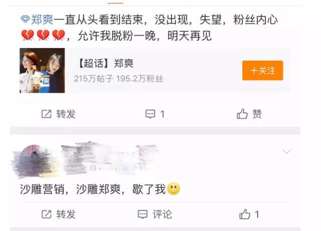 當然也有粉絲為鄭爽「挽尊」,認為珍貴的人沒那麼輕易等來,還是收拾心情看劇;以及還有人覺得節目本身沒有給鄭爽發揮的空間,鄭爽「身為一線花旦,只是上去站一下太掉價了」……只能說,這真是忠實鐵粉啊。