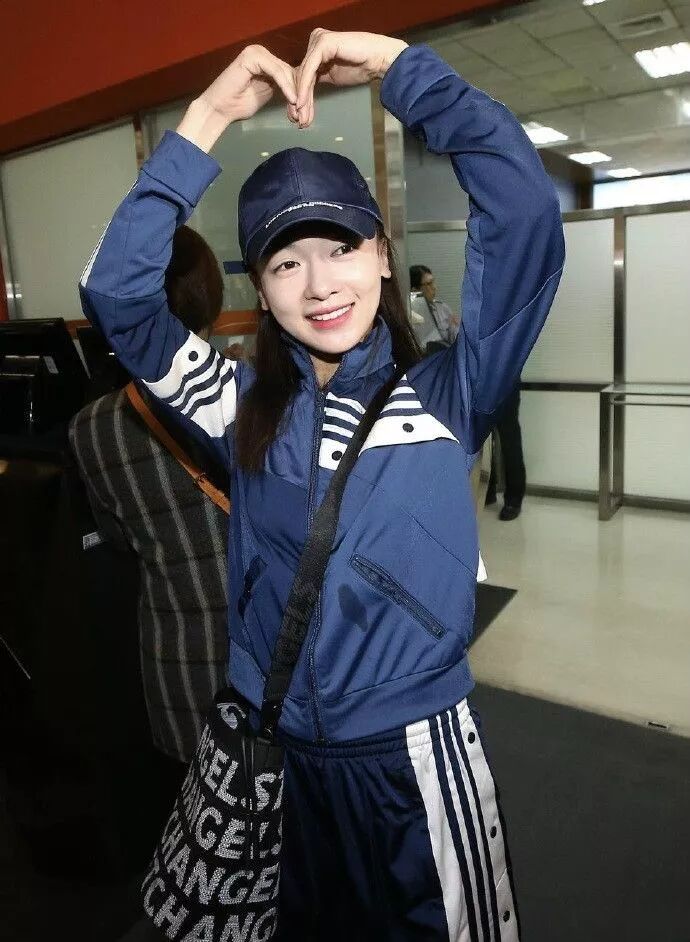 藍色套裝,有種學生妹既視感,同時運動款式上衣,搭配寬鬆褲子,看起來更加接地氣,同時搭配的斜挎包,為自己加分。