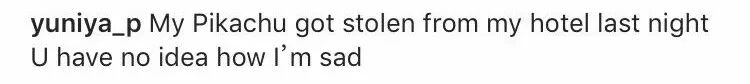 她還是一個十足的皮卡丘狂飯。如果不工作,願意 24 小時和皮卡丘待在一起。曾經發生過一起她放在酒店的皮卡丘被盜事件,她為此難過了好久。