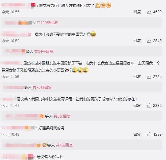 網友們紛紛感嘆,為什麼自己就沒遇到這樣的男孩兒呢?還有的網友立刻跪求黑衣男生的聯繫方式。甚至有網友建議編入教科書,編入九年制義務教育課程,讓我們的男孩子成為令人愉悅的存在!