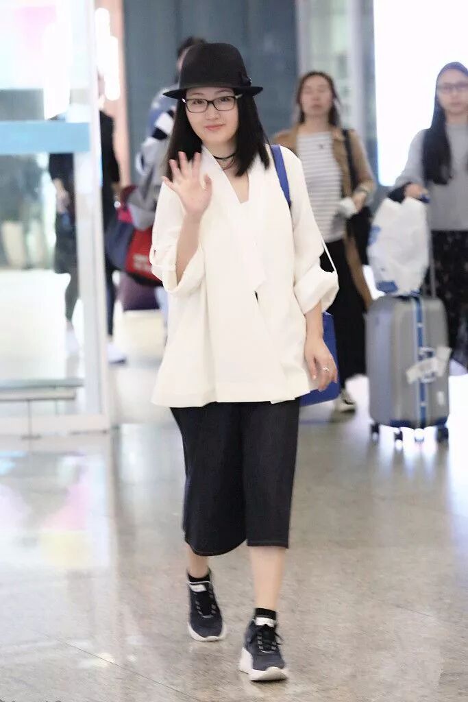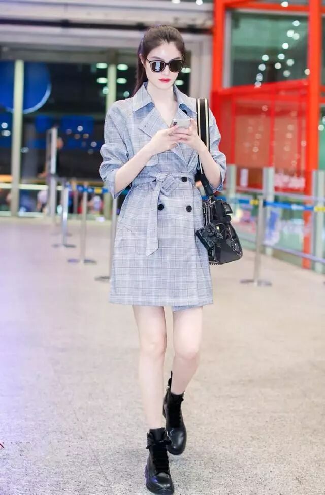 何穗的皮膚真是白啊,感覺在機場的穿搭根本就是不用P就很白的那種了,穿一條淺灰色的格子風衣裙,很知性優雅呢,不過看穿的裙子,都短到大腿跟了,看來腿真是長的很過分呢。