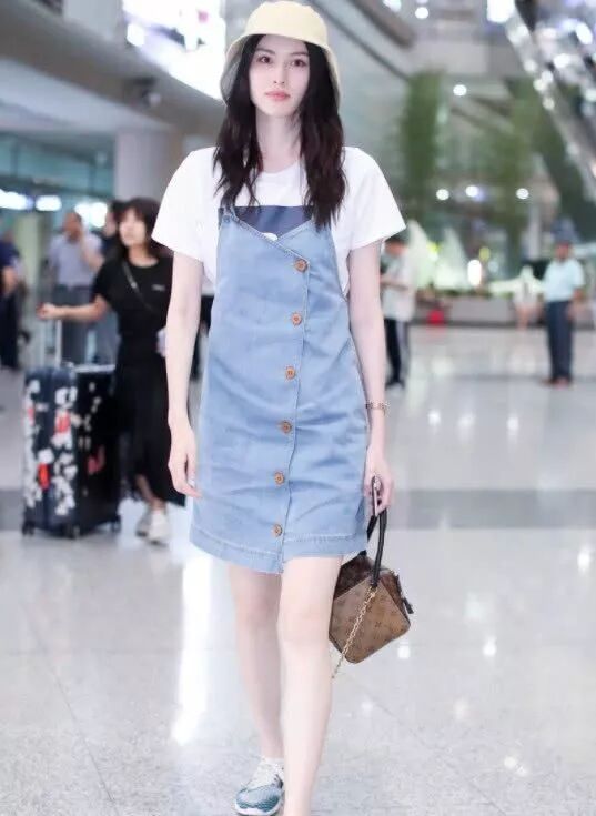 當然即使大長腿也有充滿少女心的時候,穿一件白T恤搭背帶牛仔裙,一排的紐扣設計,蠻有時尚感,同時也穿出了少女感。