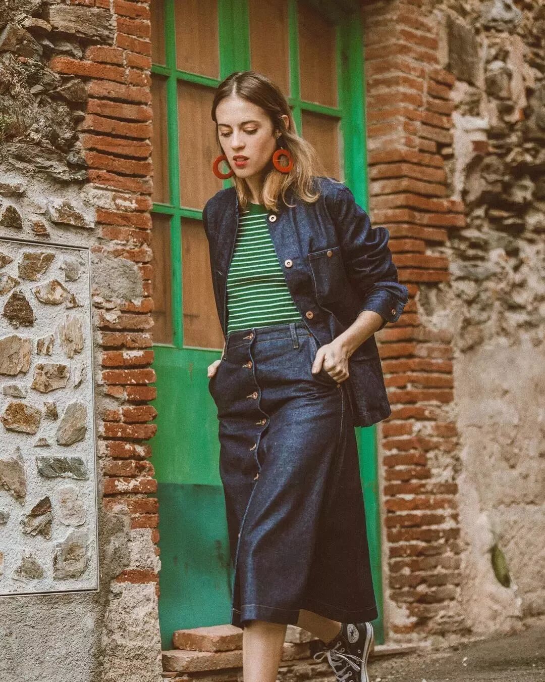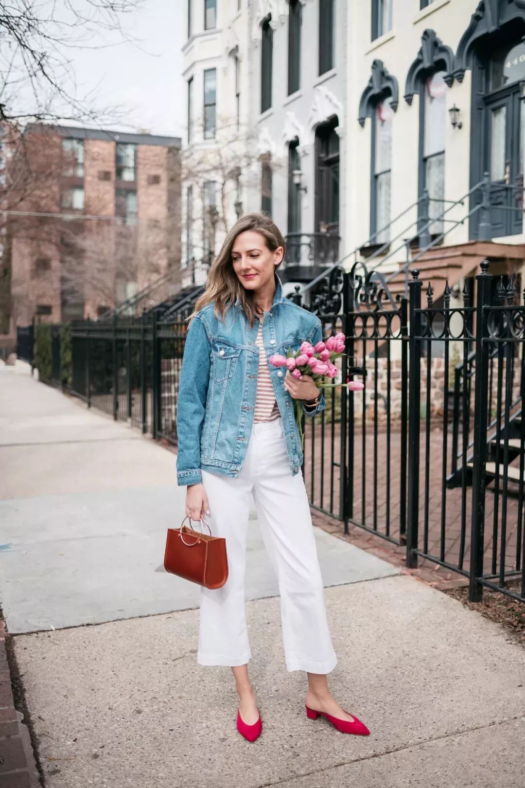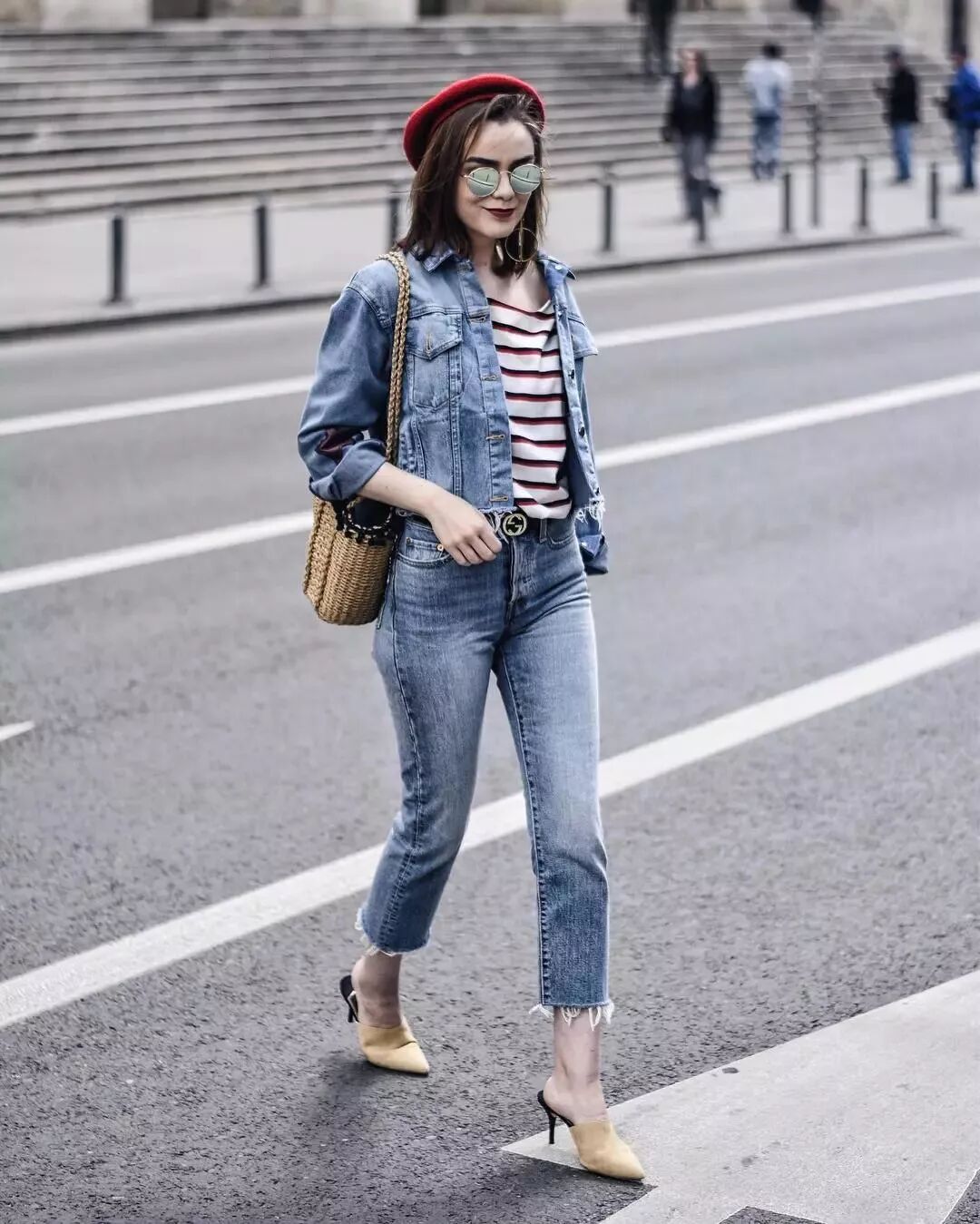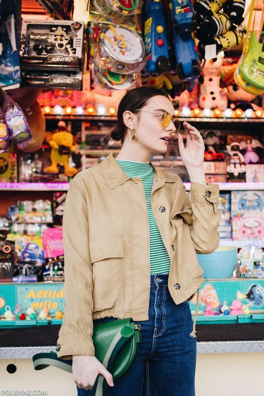 牛仔搭條紋也是十分經典的搭配,用綠白條紋來過渡,大紅耳環來點睛,很有意思。