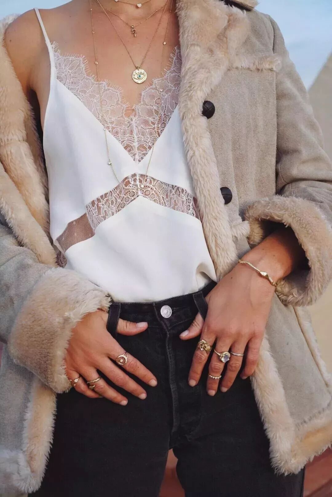 這一類的真絲吊帶和秋冬的西裝簡直絕配,整個人的氣質一下子就凸現出來了。