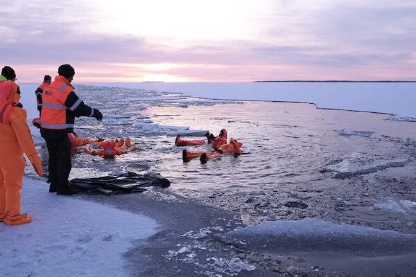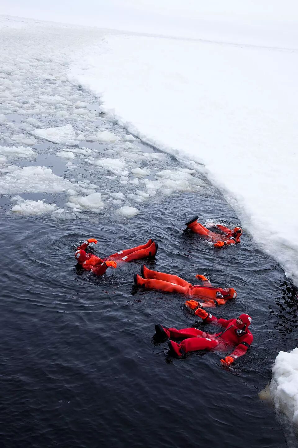 橙紅色的氯丁橡膠防水保暖衣穿在身上,有沒有小龍蝦的既視感?尤其在冰海上漂浮時,從遠處看來就是一群在波的尼亞灣遨遊的小龍蝦!