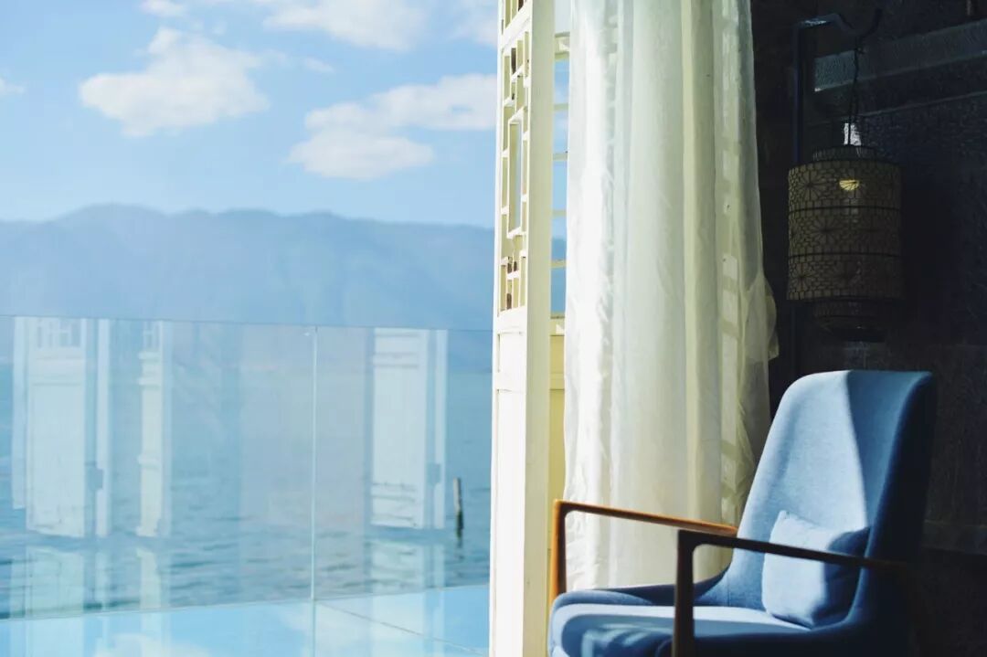 最貼近洱海的則是這一樓的兩間房,簡約的藍色主調,與洱海相輔相成。推開玻璃門就是無遮擋的小陽台,席地坐在陽台邊,光著腳丫嬉一嬉海水,閒暇的趣味時光都被放大。
