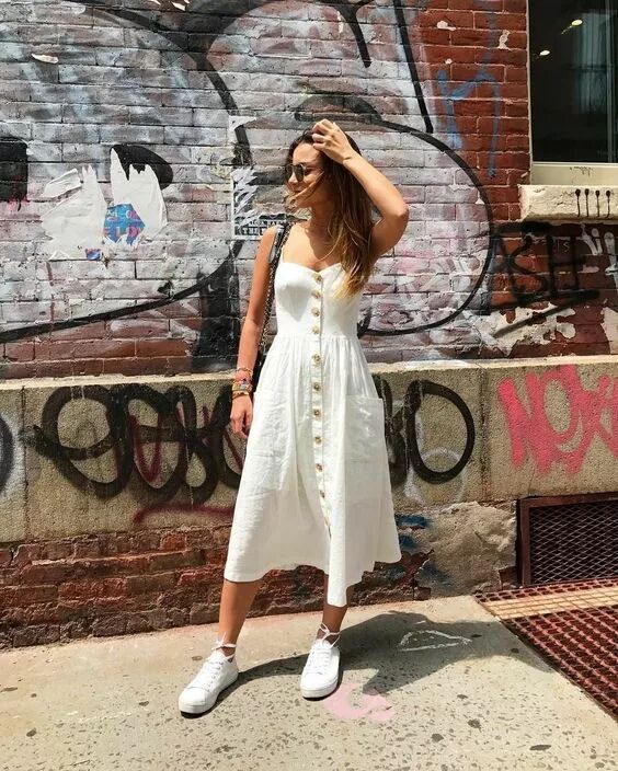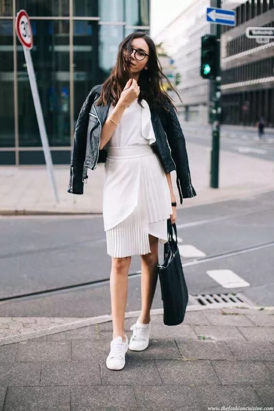 不過根據今年的流行,用小白裙混搭硬朗風格的單品碰撞出反差感,會更時髦,例如運動鞋。