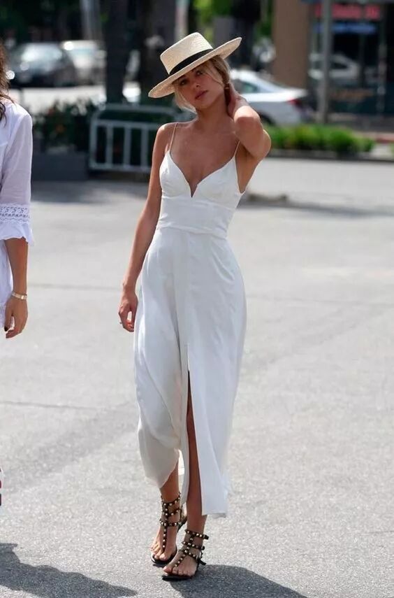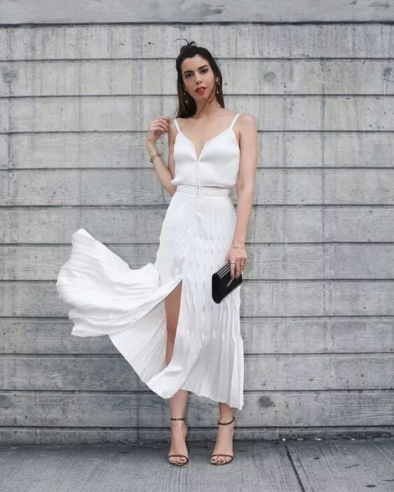 細吊帶的小白裙會讓整體看著更加精致優雅。不過肩寬的女孩就要慎重一點,因為越細的吊帶會反襯肩部的寬闊,讓身材看著更魁梧。