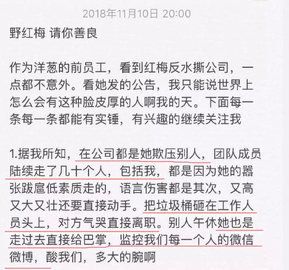 她說野紅梅在公司特別的囂張,因為她的欺壓,已經有十多個同事離職了,她曾把垃圾桶砸在工作人員頭上,還直接扇別人巴掌。