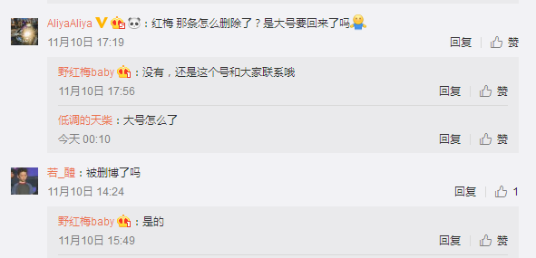 現在這條微博已經刪除了,但野紅梅說不是她刪的。