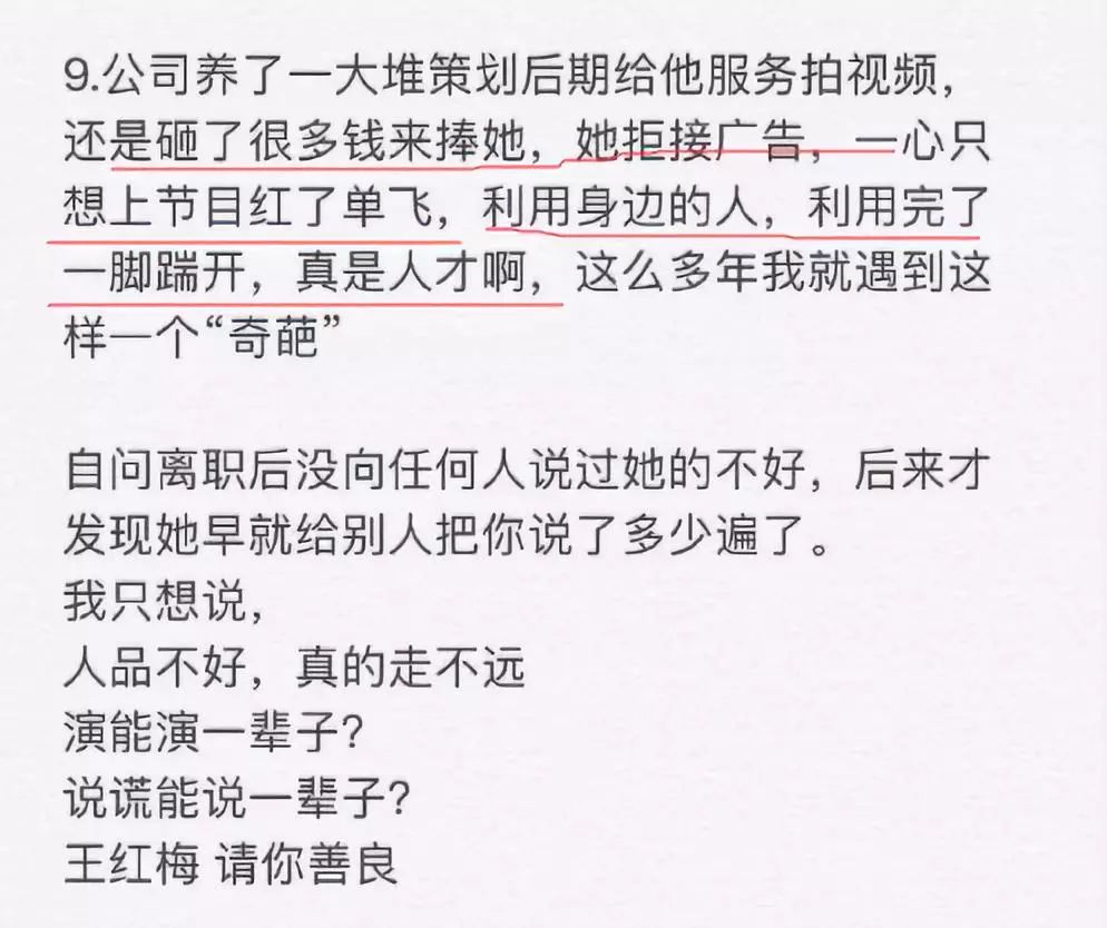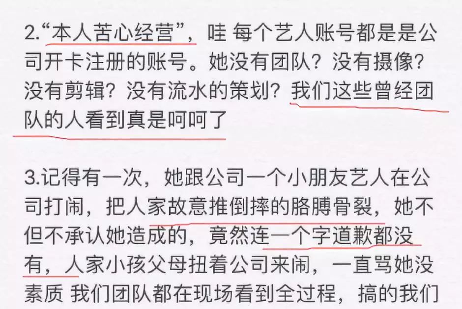 她說的「本人苦心經營」的帳號,其實背後有團隊很多人的努力,還有次她在公司和藝人打鬧,故意把對方推倒摔的胳膊骨裂,卻連句道歉都沒有。