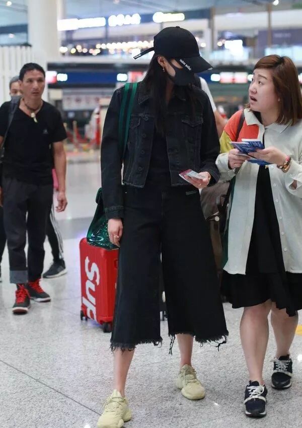 黑色套裝,讓關曉彤更加高挑迷人,同時搭配一雙米色運動鞋,看起來更加接地氣,同時寬鬆闊腿褲,更加洋氣。