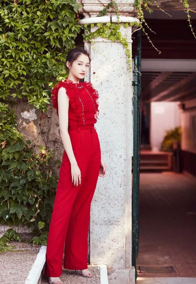 紅色套裝,襯托膚色,讓關曉彤看起來更加接地氣,同時搭配一雙一字帶高跟鞋,穿出迷人氣質,看起來富有時尚感。