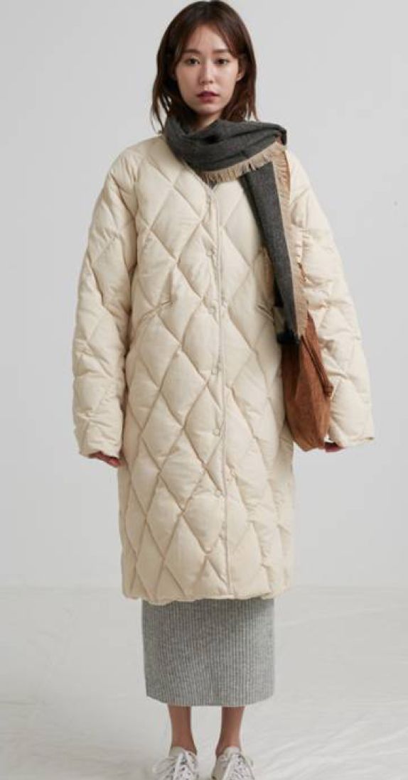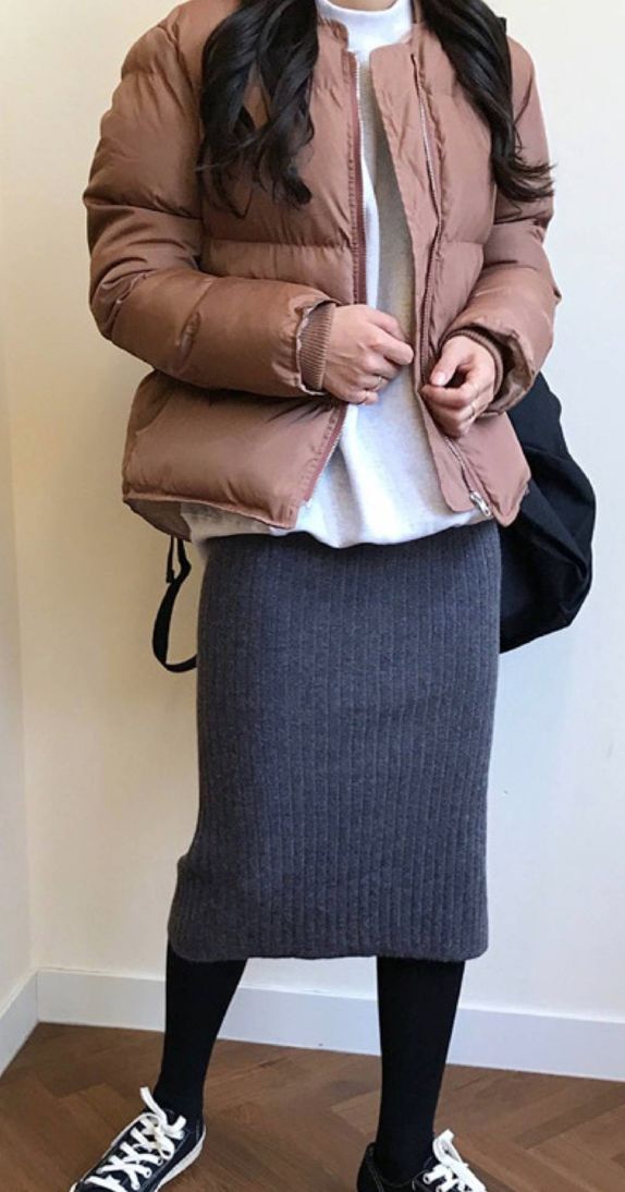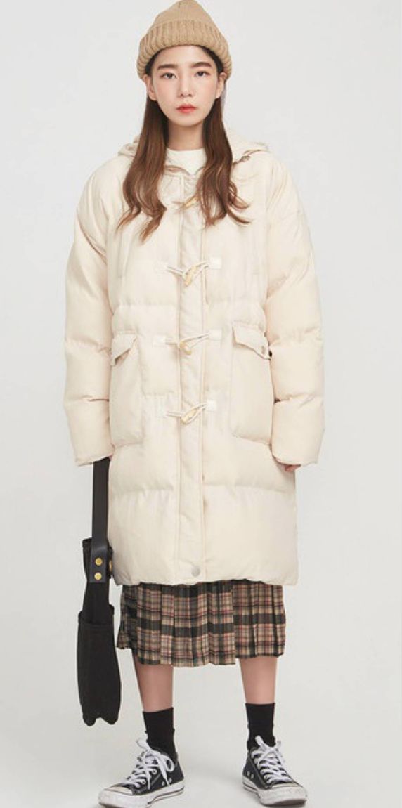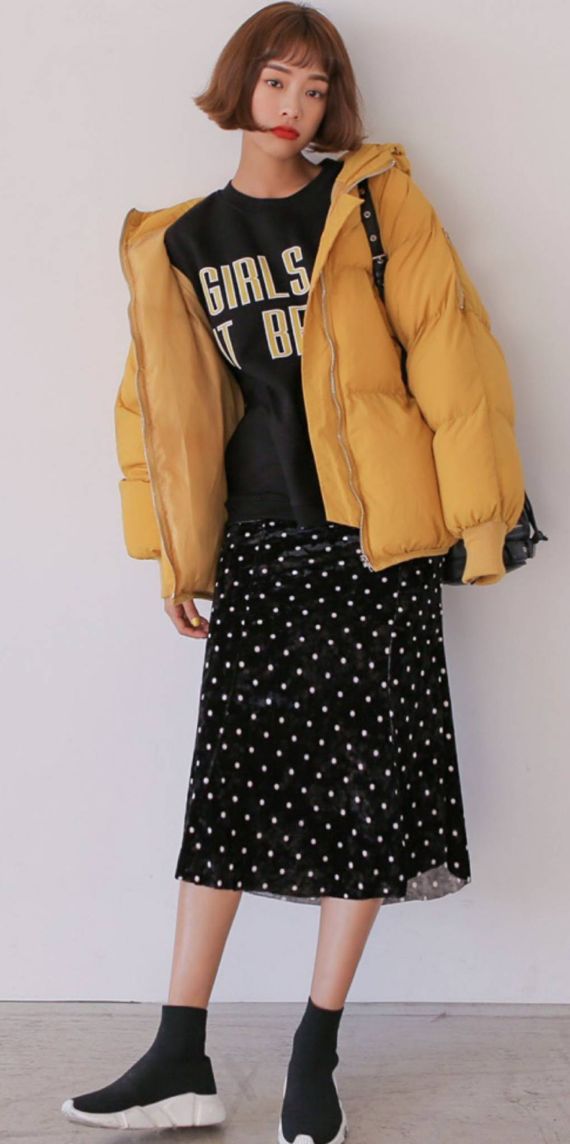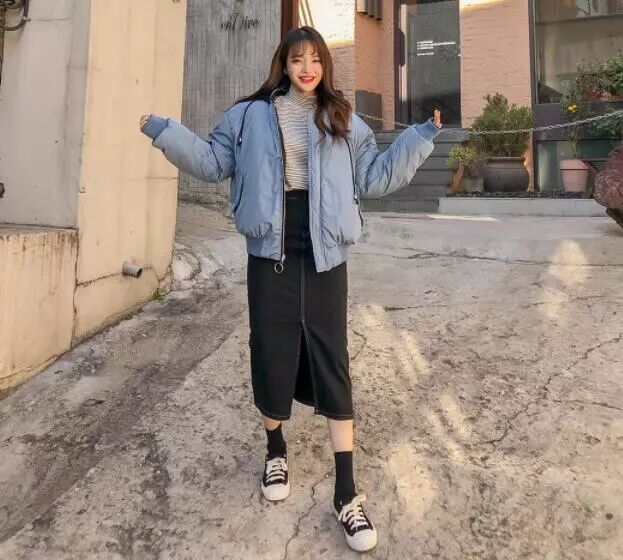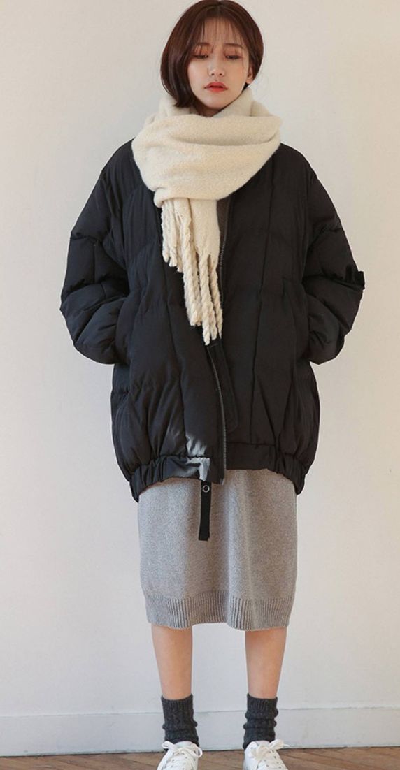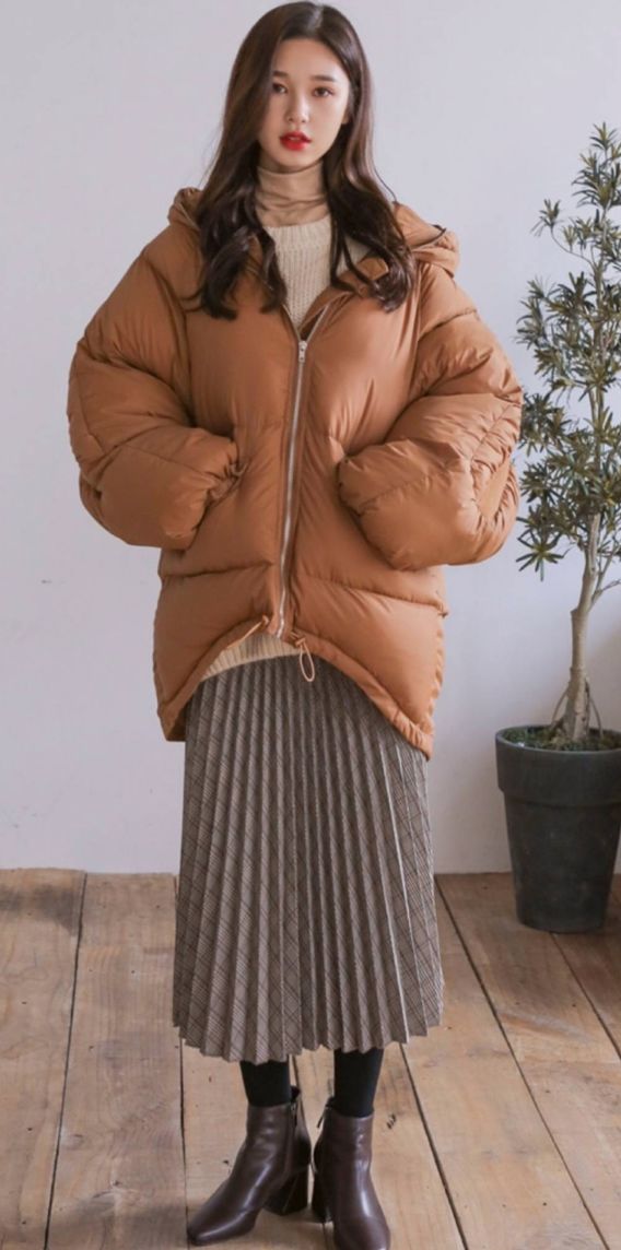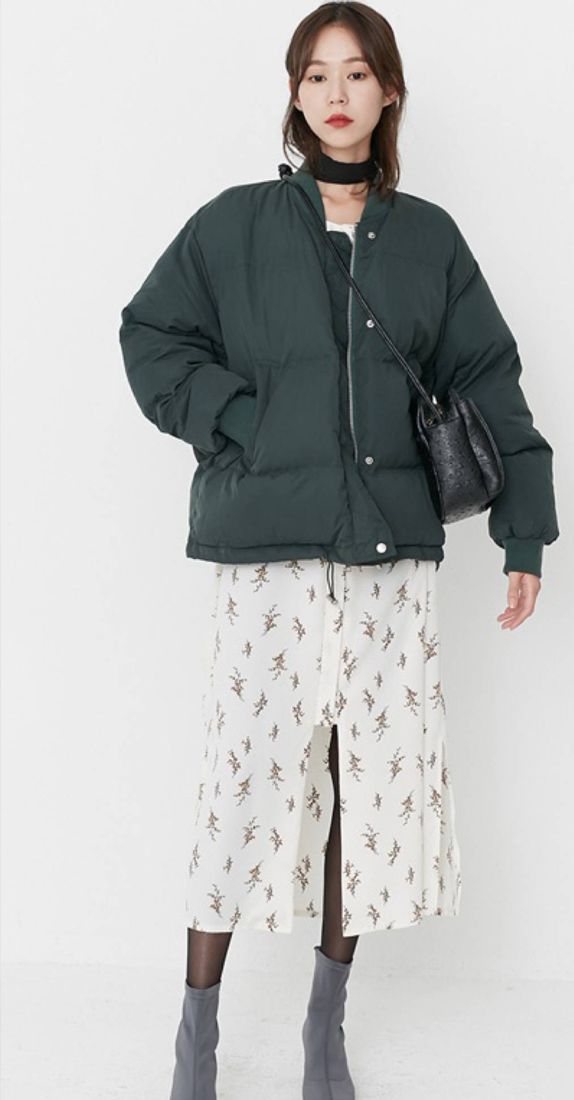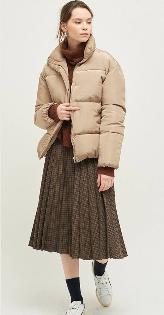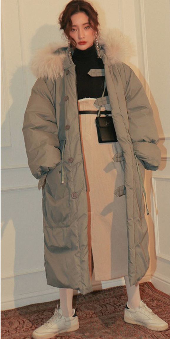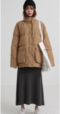 長款的羽絨服搭配半身裙,露出5~8cm 長度的裙擺會更好看!