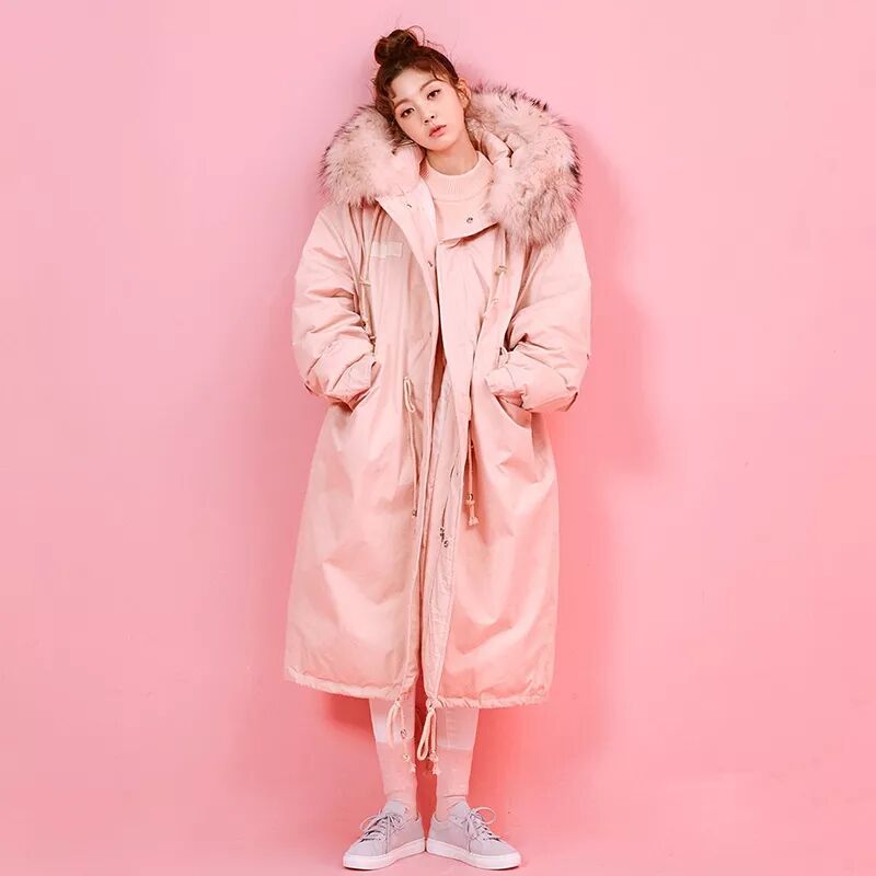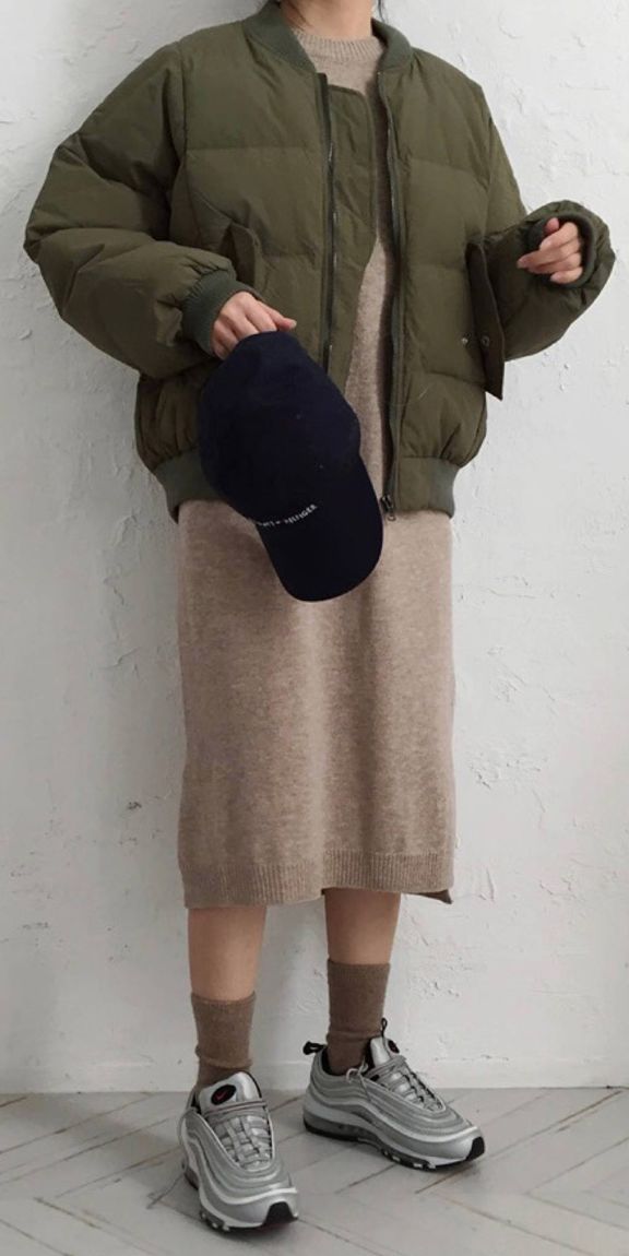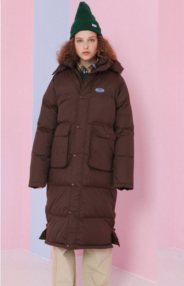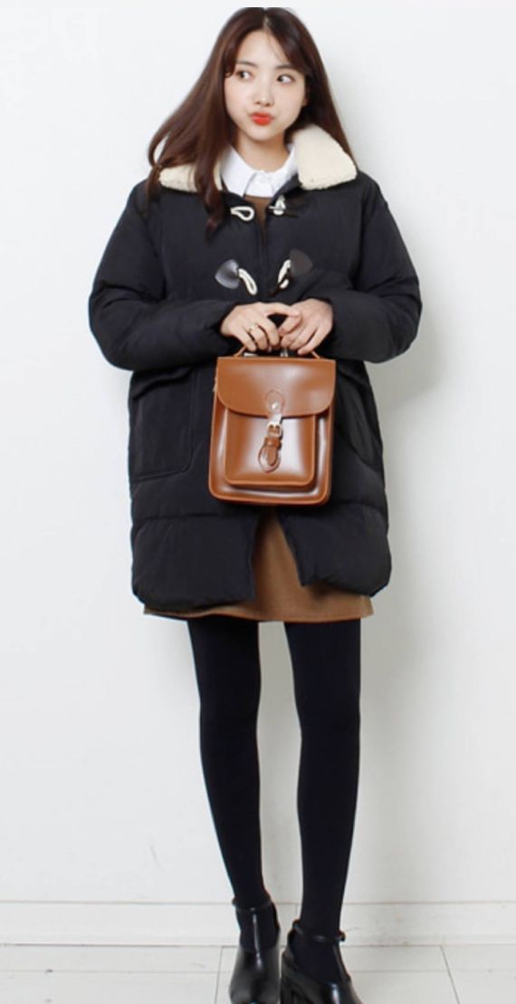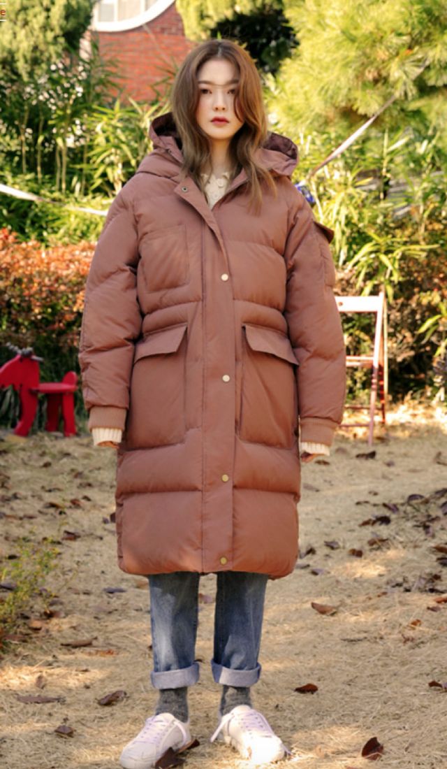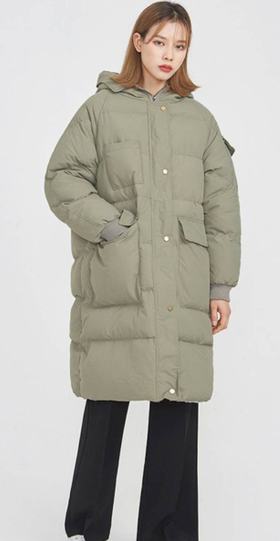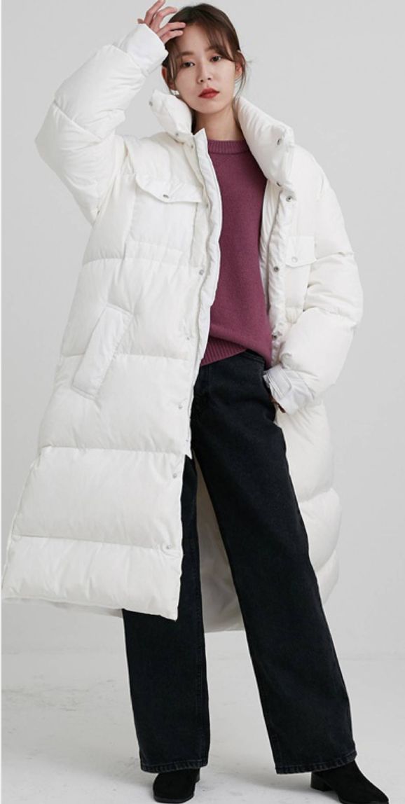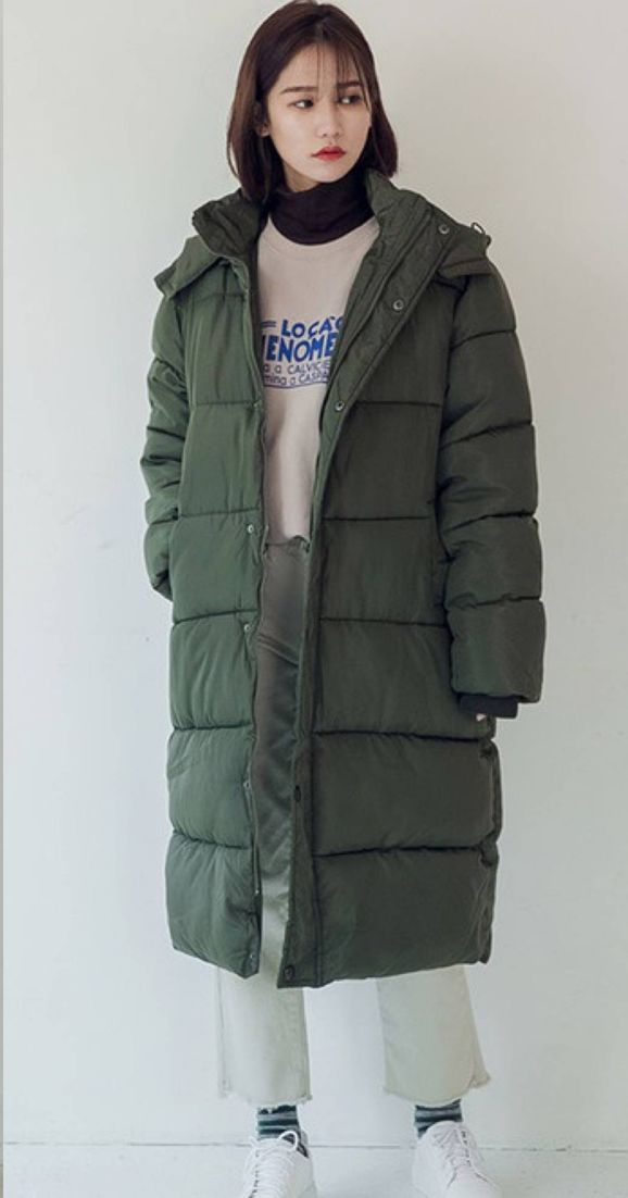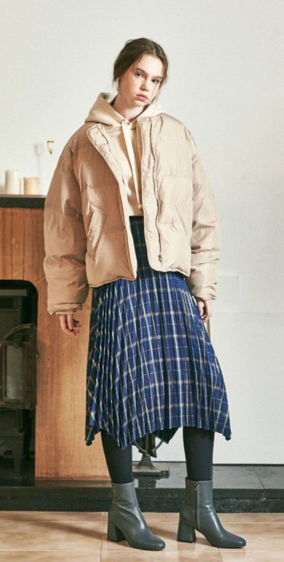 長款的羽絨服搭配半身裙,露出5~8cm 長度的裙擺會更好看!