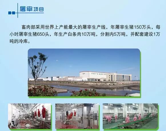食品產業園區是採用世界先進衛生標準、先進裝備水平建設的肉食加工基地。一期屠宰加工項目,採用世界上產能第一的屠宰生產線,年屠宰生豬150萬頭,每小時屠宰生豬650頭,年生產白條肉10萬噸,分割肉5萬噸,並配套建設6000噸冷庫;二期規劃建設年產5萬噸肉制品加工項目及1.5萬噸冷庫。目標做到年出欄200萬頭生豬、年屠宰加工500萬頭生豬和年產5萬噸肉制品的百億元產業集群。
