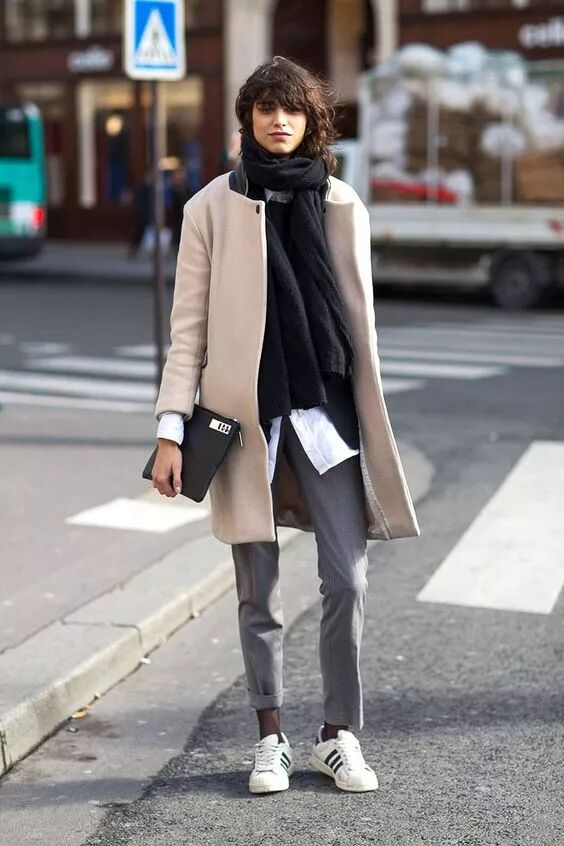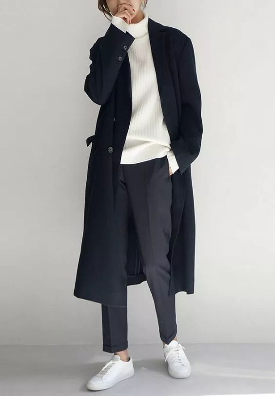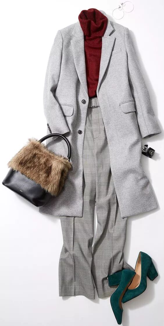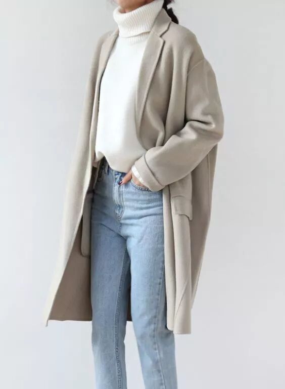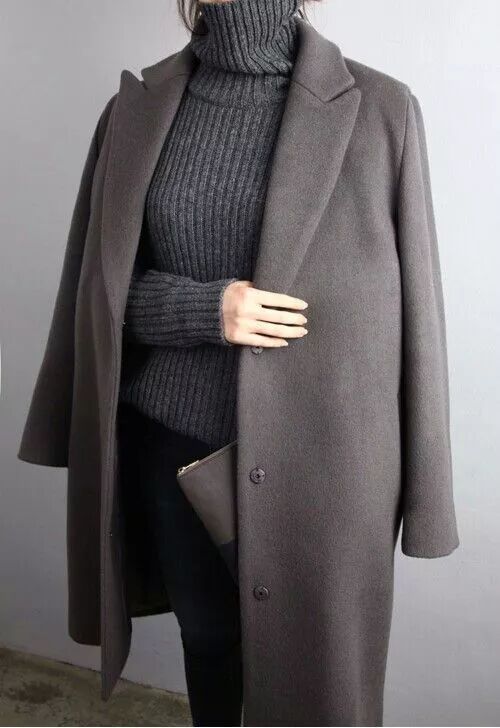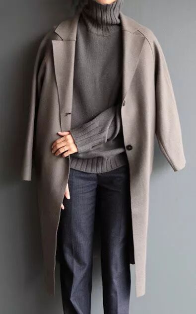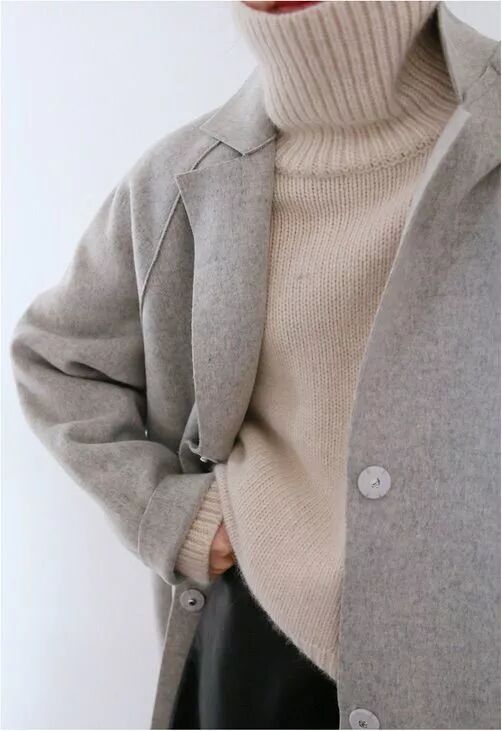 灰色大衣和肉色高領毛衣也是很好融合的顏色,怎麼搭都不容易出錯。