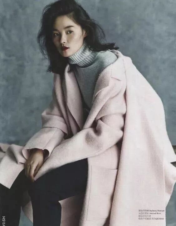 帶有少女感的粉色系大衣搭配淺灰色高領毛衣不僅顯得氣色好,也更具有小女人的淡雅氣質。