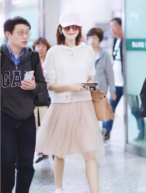 娜紮的這身運動風的白色棒球帽、白色衛衣和小白鞋混搭粉色紗裙,打造出時下大熱的娘Man風格的同時,也給人很清新養眼的愉悅美感。