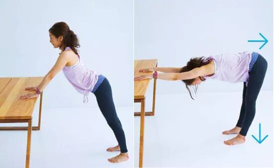 膝蓋和腰不好的人做下犬式會比較困難,借助桌子來變形這個動作也能達到拉伸腿部後側肌肉線條的作用。