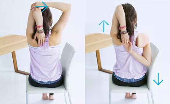 Tips:如果無法兩手相握,可以用一條毛巾做為輔助,但一定要保證胸腔到手臂的最大限度拉伸。