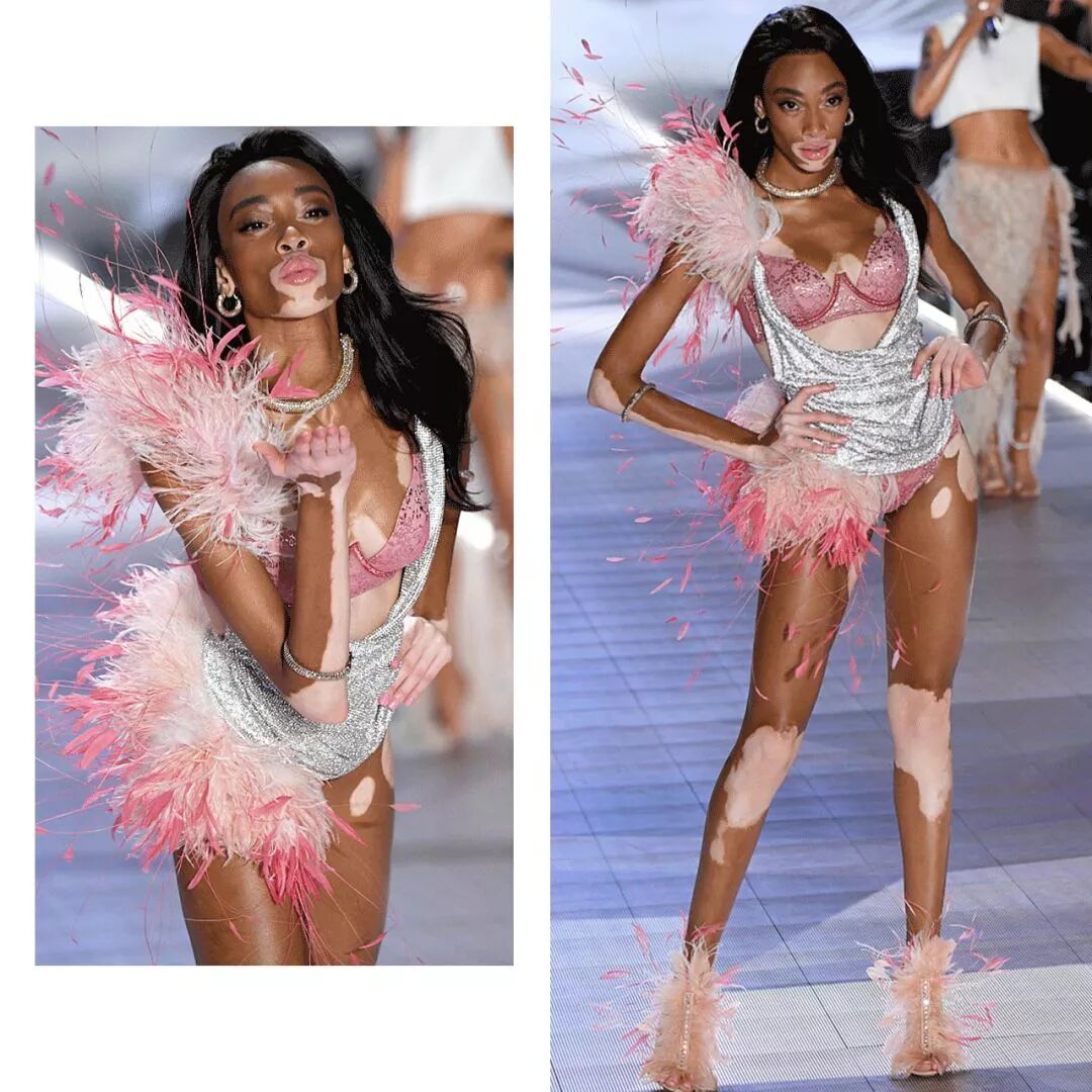 罹患白癜風的超模Winnie Harlow 首次在維密亮相,拿到了兩個 look,一套是毛茸茸的 Flight Angel 系列,粉色系的內衣的鞋子,加上 Winnie 特殊的膚色,超可愛的。
