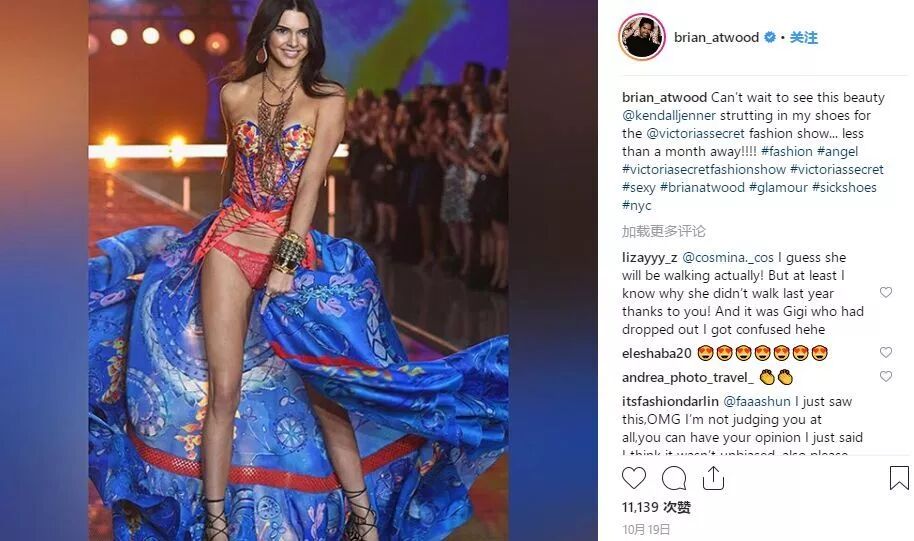 此次維密大秀全部鞋子來自美國設計師 Brian Atwood,他是一位具有墨西哥血統的美國設計師,顏值很高,對鞋子的熱愛近乎癡狂。就是他最早在自己的 Instagram 上曝光了 Gigi 與 Kendall 確認上秀的消息。