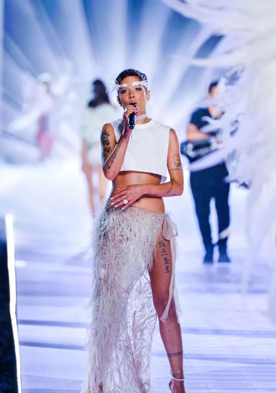 Halsey 露蠻腰羽毛裙亮相獻唱,眉毛變天使翅膀。