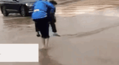 雲南大理突降暴雨,馬路積水很深。一位老爺爺脫了鞋,正背著老奶奶過馬路,雖然走得蹣跚,但兩位老人的笑聲很甜。