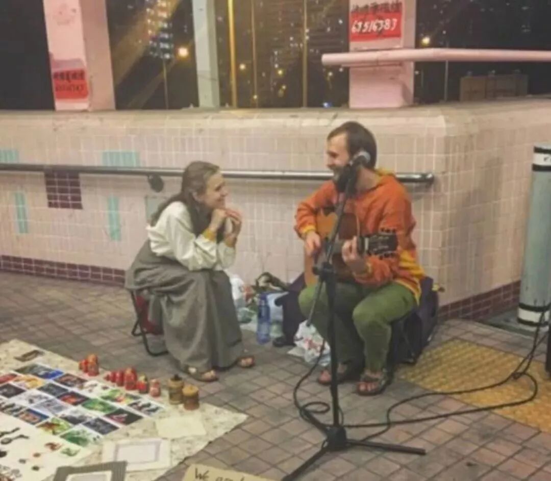 這對流浪情侶,以街邊賣藝為生,男人正彈著吉他唱情歌,女人托著下巴,全神貫註地聽著。