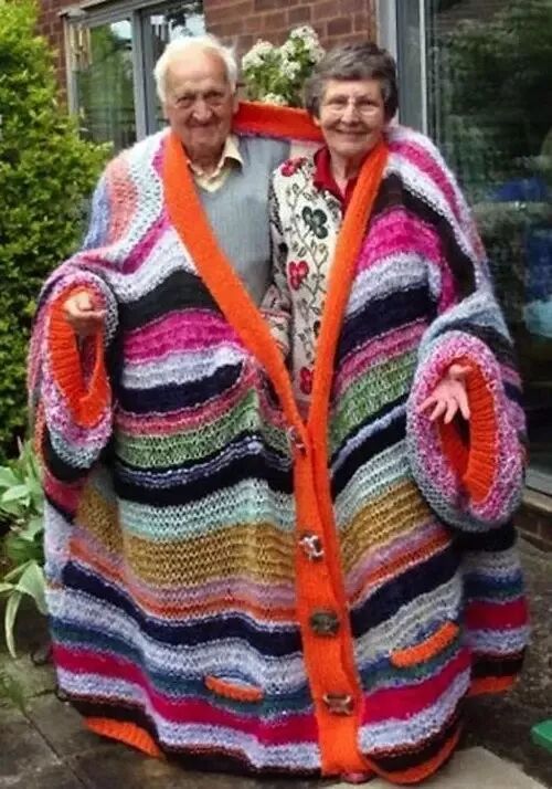 退休後,爺爺奶奶一起迷上了編織,穿著合作完成的巨無霸情侶毛衣,這對老夫妻真的太酷,太有愛了。