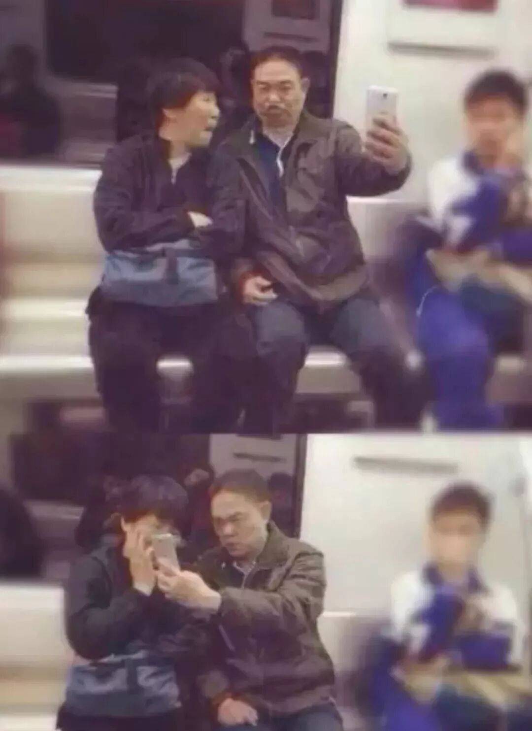 地鐵上一對中年夫妻正在玩兒自拍,面對鏡頭,他們擺出各種搞怪的表情。大叔拍完給妻子看,妻子頓時哈哈大笑。