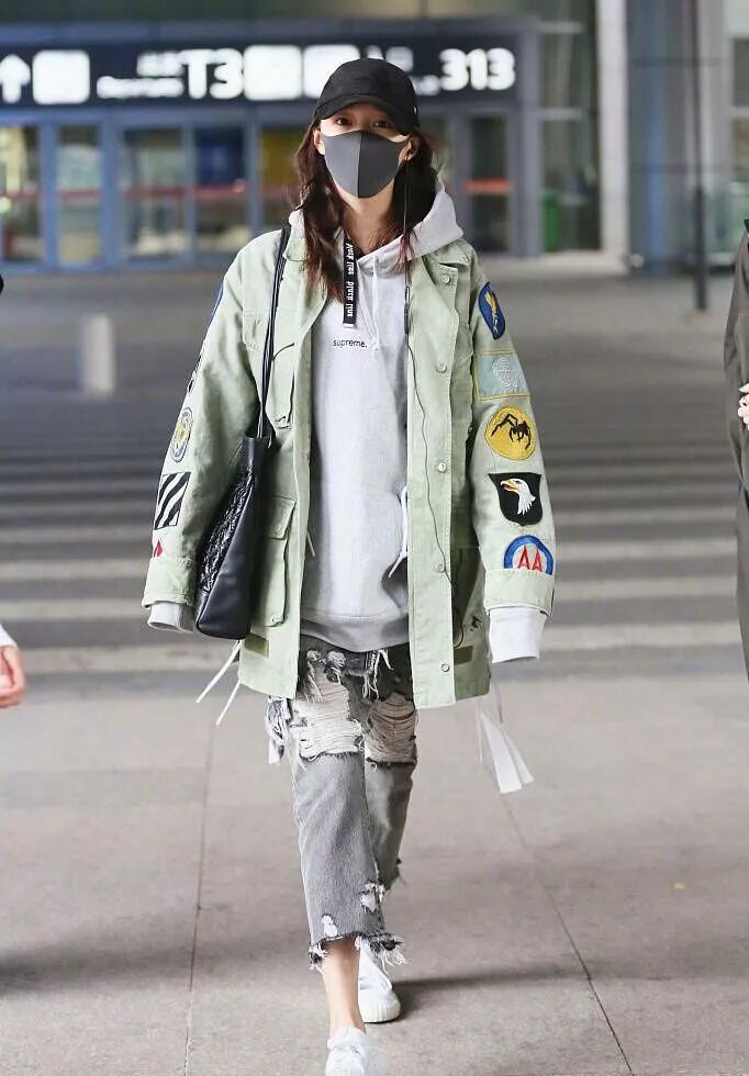 綠色的工裝服看起來特別的帥氣了,內搭的是一件白色的衛衣,特別的簡約的樣子了,下半身搭配了一條破洞的牛仔褲