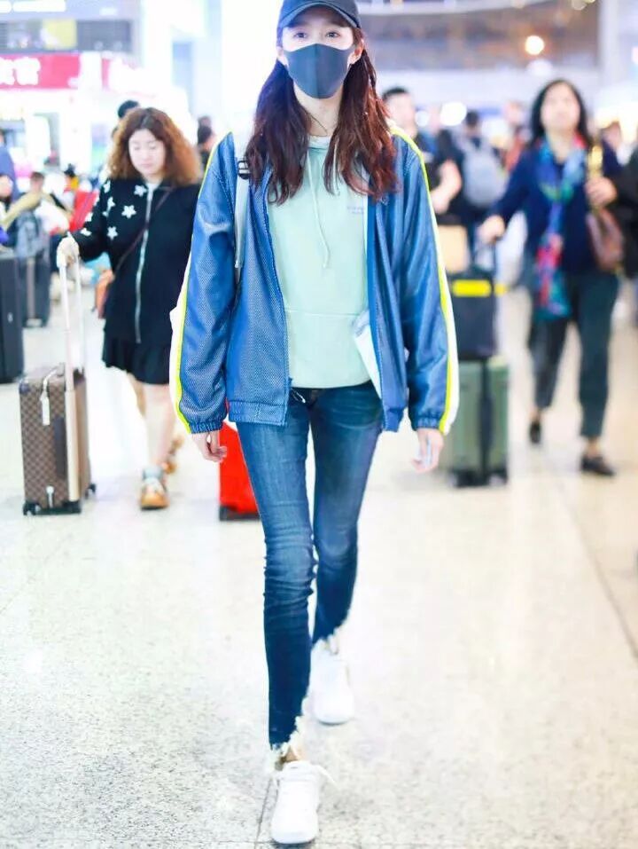 關曉彤穿了一身非常運動風的衣服,上半身一件藍色的外套,下半身搭配了一條牛仔褲,牛仔褲特別的有設計感,看著比較的青春