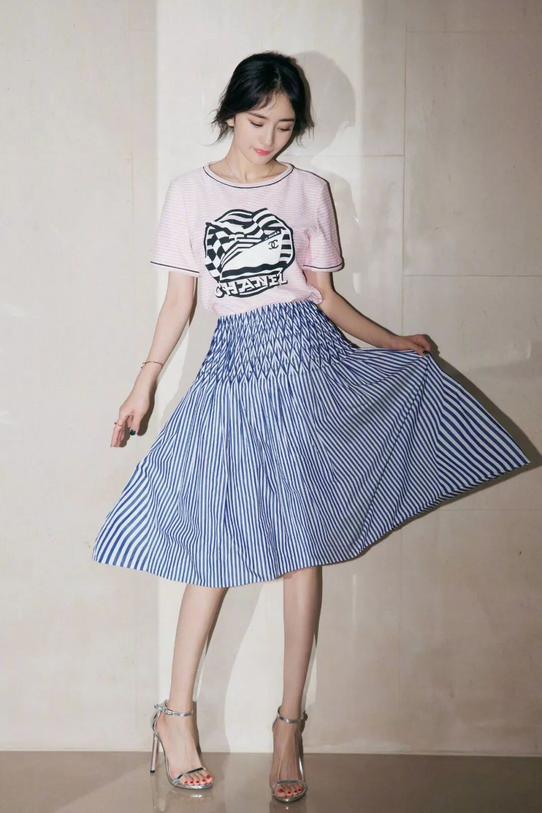楊冪的性感半身裙,讓自己更加迷人氣質,同時腳踩一雙一字帶涼鞋,女人味十足,讓人們十分喜歡,穿出活潑感。
