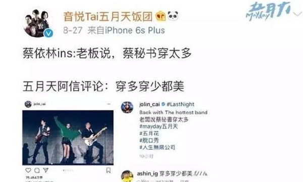 以及蔡依林在ins上的動態:老板說,蔡秘書穿太多。然後隨後阿信評論說:穿多穿少都美。看了演唱會的相信都知道,這個只不過是演唱會上的一個梗而已,兩人都是在開玩笑。