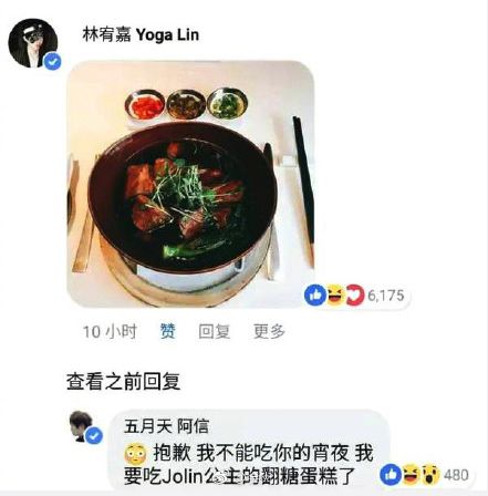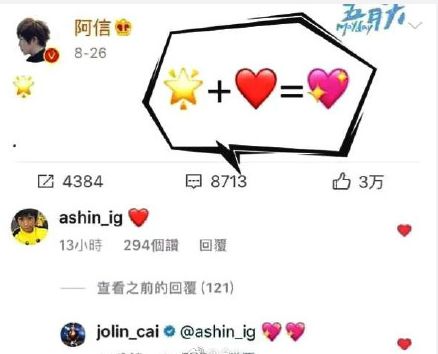 林宥嘉在社交平台發了一組美食的照片,阿信回復:抱歉,我不能吃你的夜宵,我要吃Jolin公主的翻糖蛋糕了。很多網友對這句話開始浮想聯翩,於是大家認為阿信已經跟蔡依林在一起了。