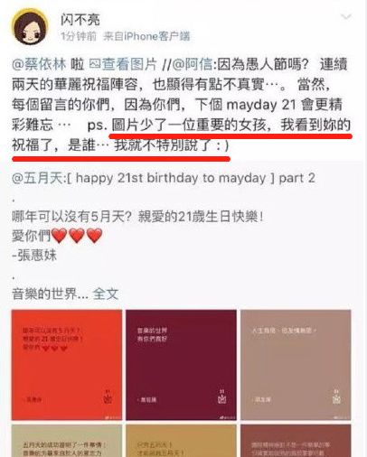而在五月天21歲生日的時候,阿信說:圖片中少了一份重要的女孩,我看到你的祝福了,是誰,我就不說了。隨後有網友找到了蔡依林的祝福,大概就是這些互動的小細節,構成了2人在一起的錯覺吧!