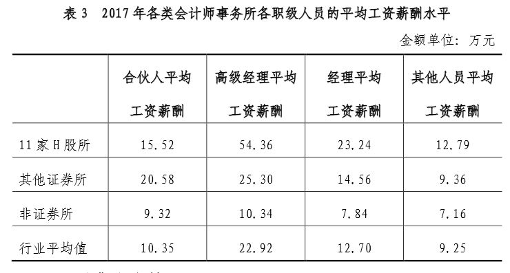 2017年度,全行業合夥人平均薪水薪酬為10.35萬元由於合夥人以分紅為主要收入來源,因此平均薪水薪酬較低屬正常現象),高級經理平均薪水薪酬為22.92萬元經理平均薪水薪酬為12.70萬元,其他人員平均薪水薪酬為9.25萬元