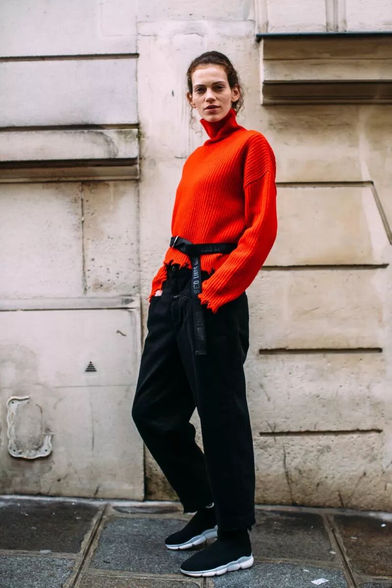 鮮艷的焦橘色毛衣熱情似火,搭配基本款的黑色闊腿褲就足夠了!