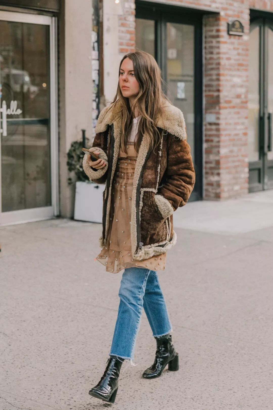 厚實的外套,一定需要一條九分直筒牛仔褲來削弱臃腫感,配上一款漆皮質感的靴子,超級利落!!