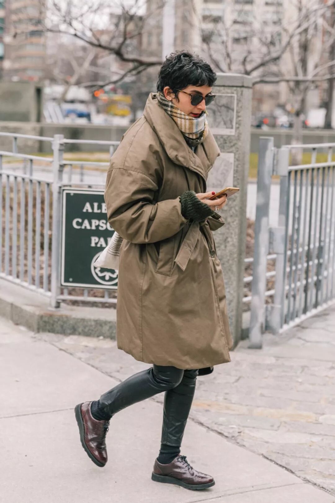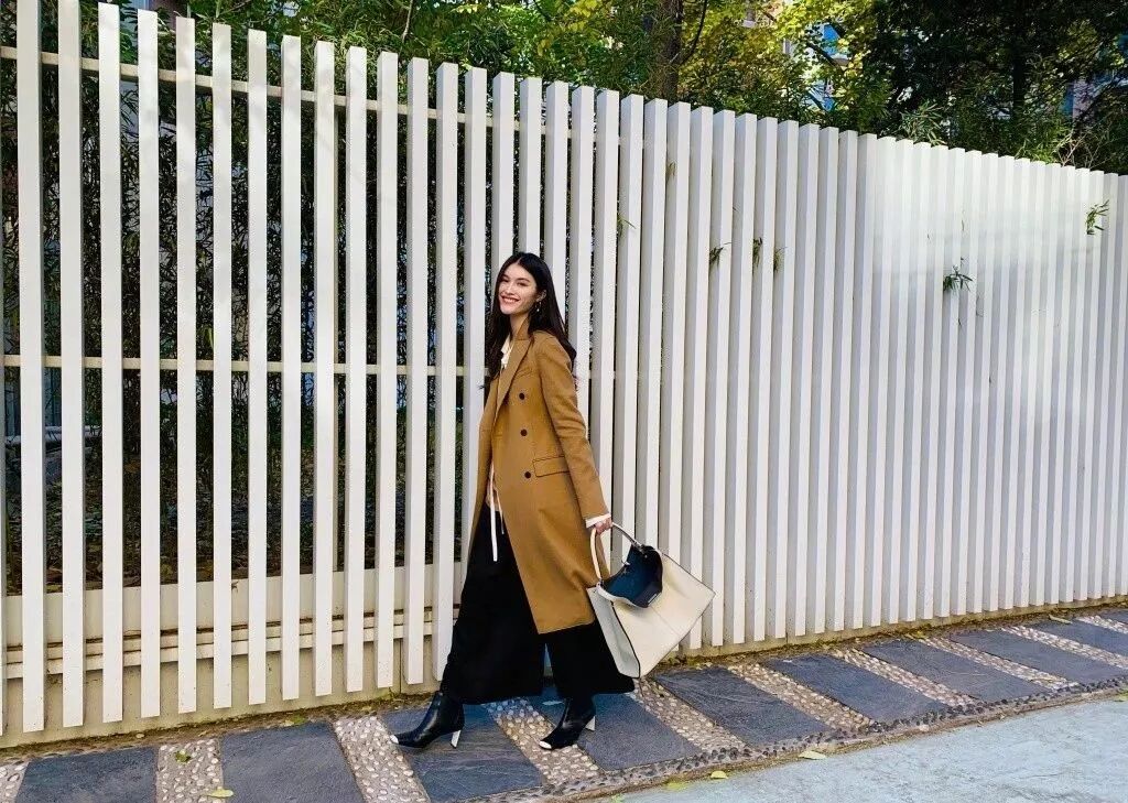 而一件豆沙灰綠的大衣,則更加清新和有韻味,翻領的設計給造型增加了內容感~