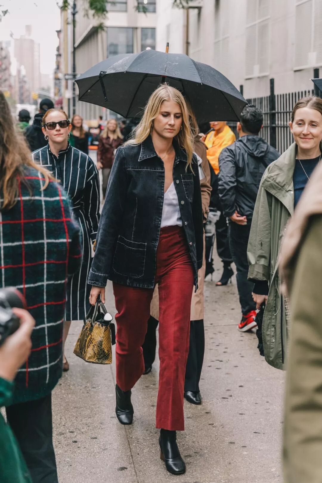 勃艮第色的煙管褲有著隱蔽的華麗感,配以黑色外套和切爾西靴,十分和諧優美~