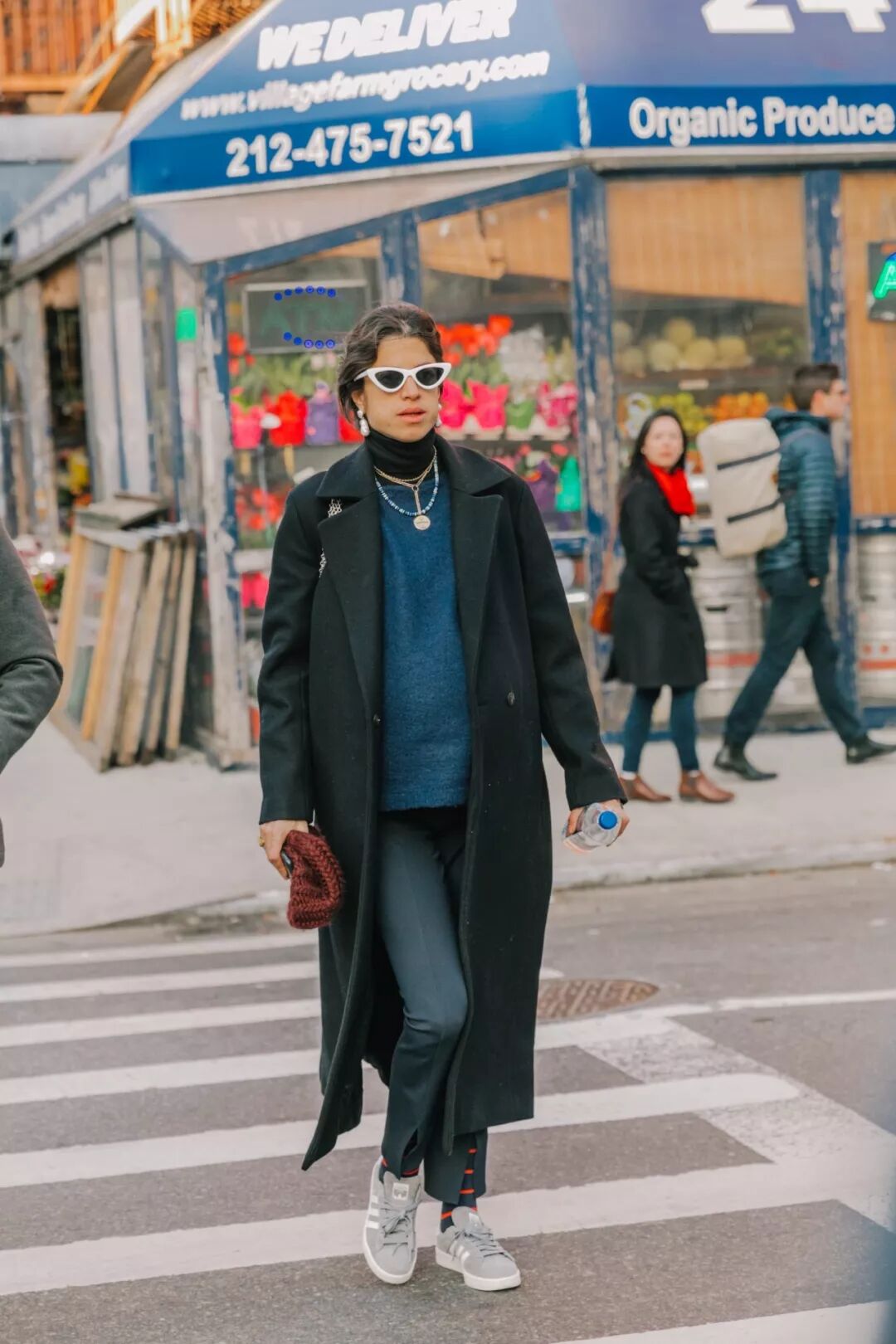 既使里面穿的長款闊腿褲,用九分大衣來搭配也顯得很利落~